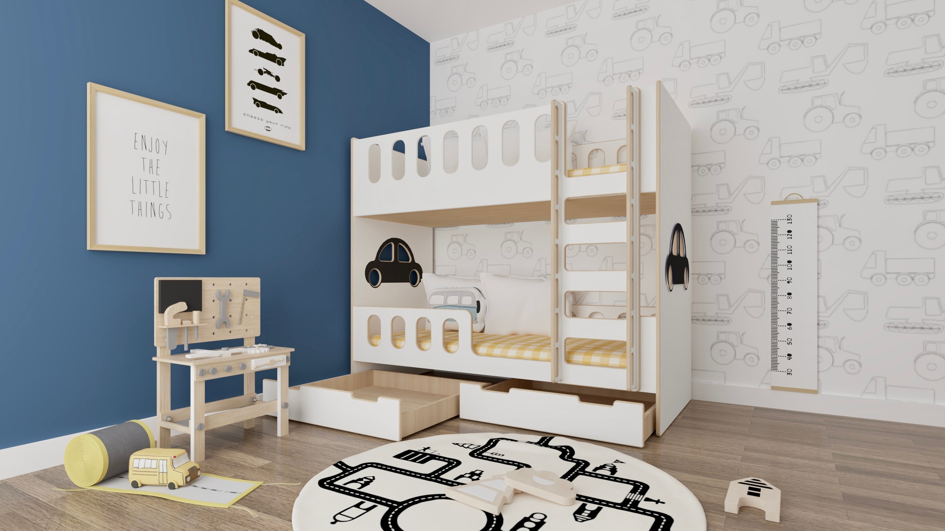 Do wyboru masz opcję z pojedynczą lub podwójną szufladą, dzięki której nie musisz martwić się o przestrzeń na kołdry i pościele. Zamiast szuflad możesz wybrać wysuwane miejsce do spania, które pozwoli twoim dzieciom ugościć kolegów lub koleżanki (materac na tym miejscu jest o 10 cm krótszy na głębokość).