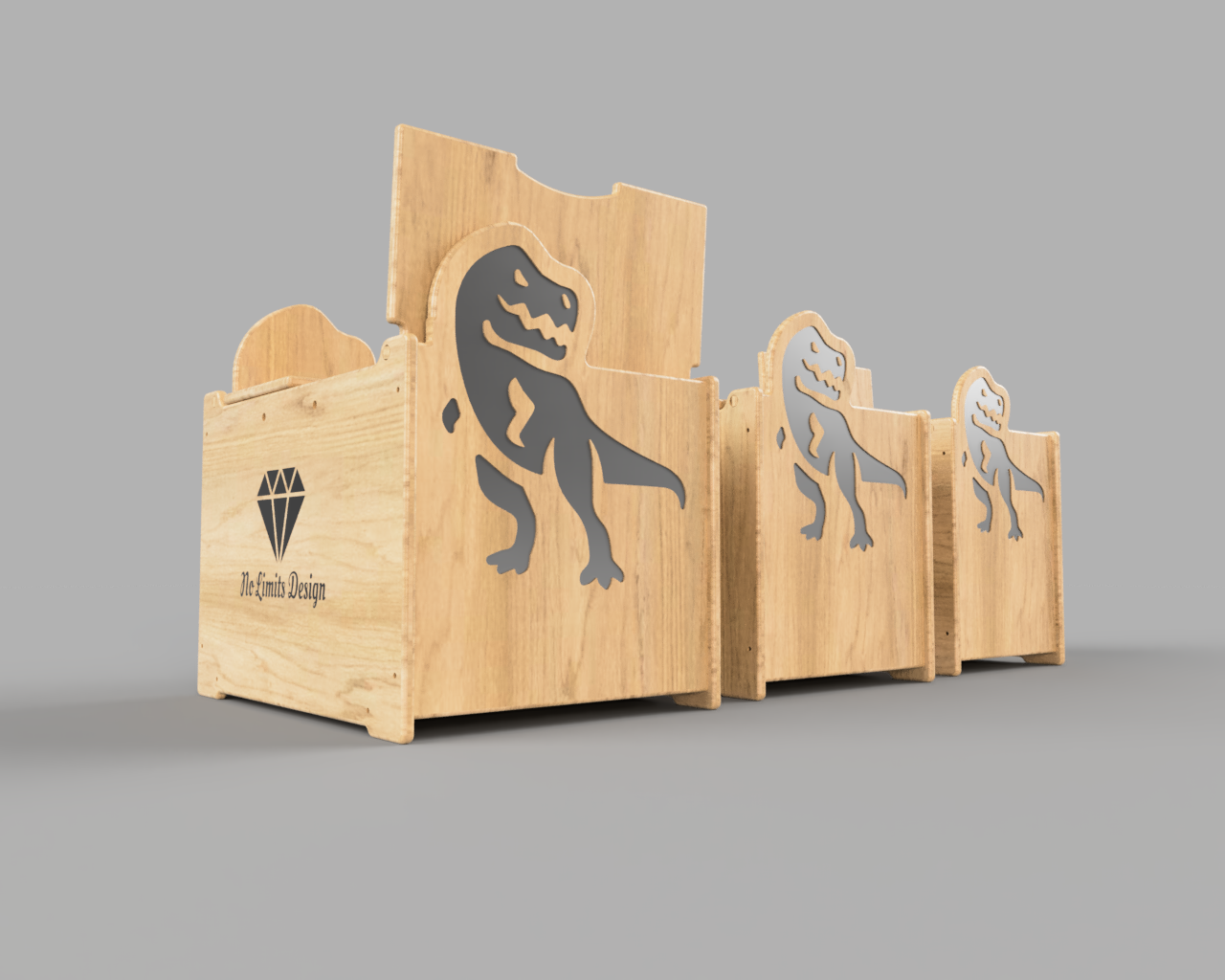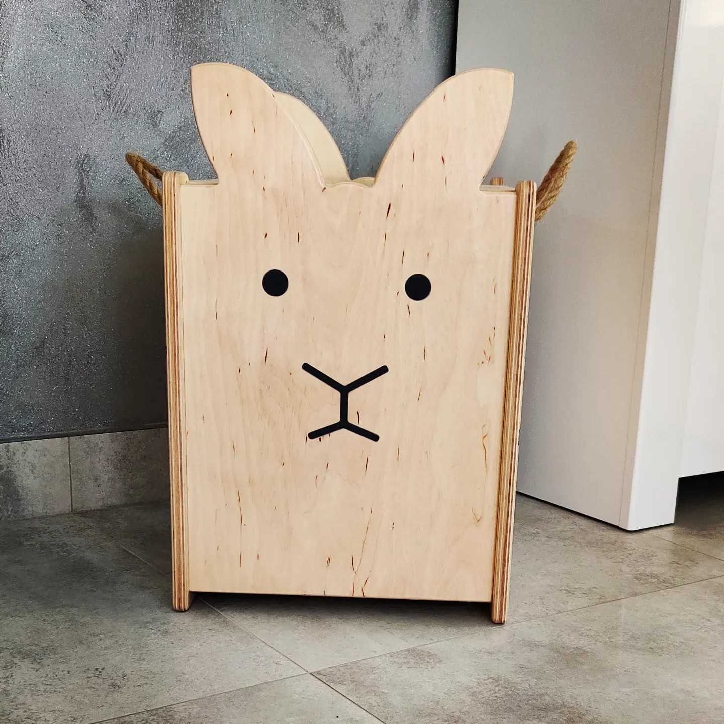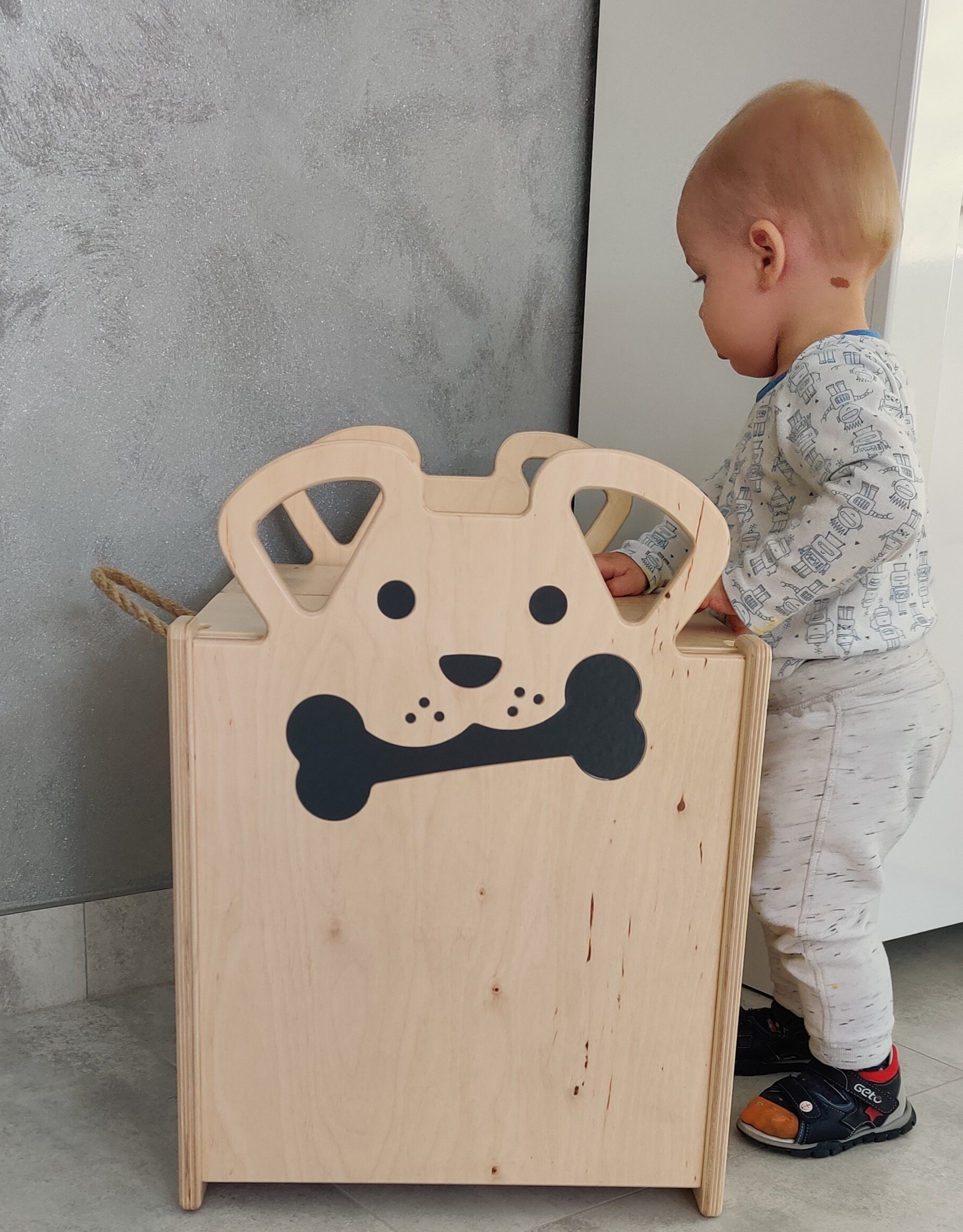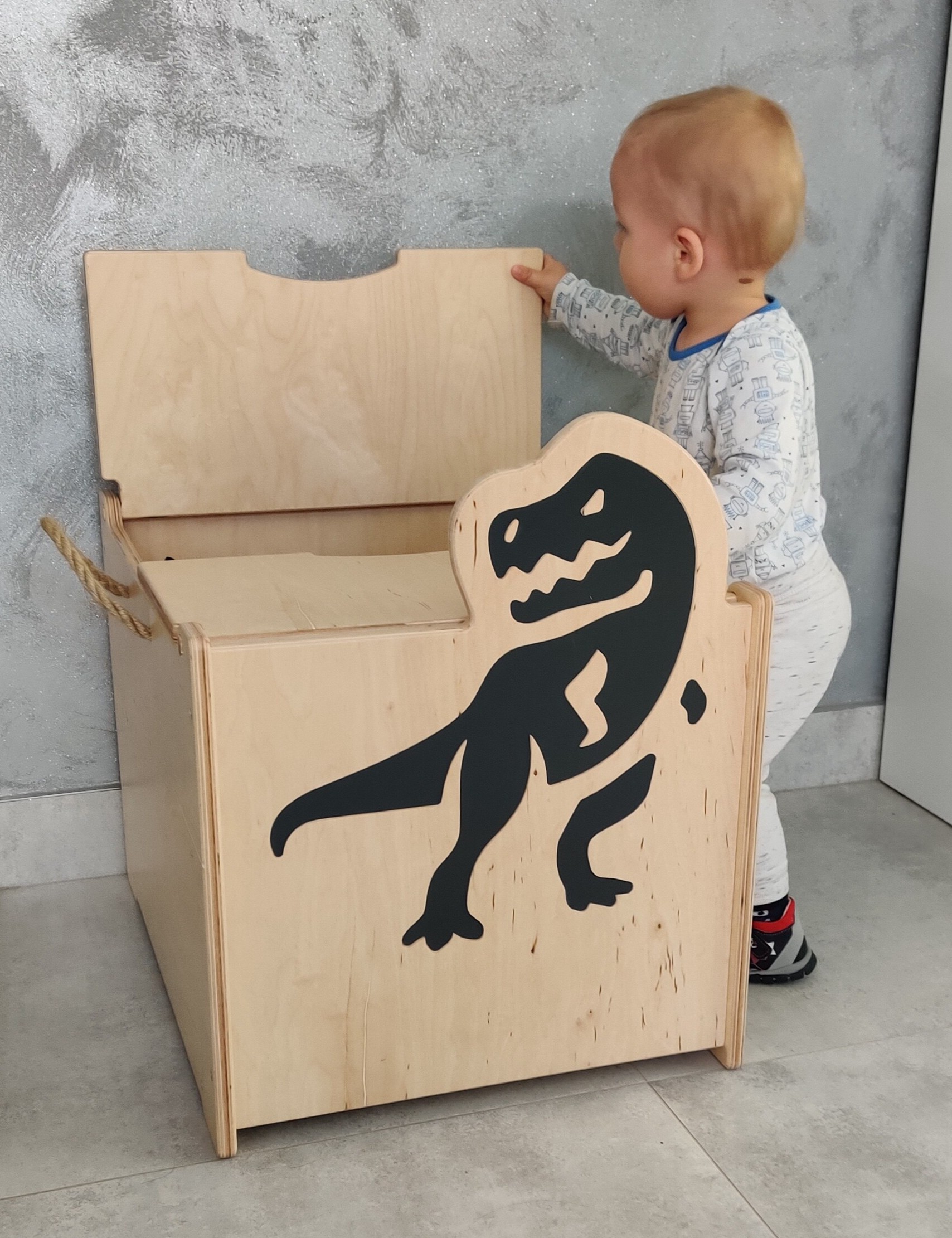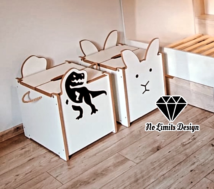 Nasze skrzynie dostępne są w 3 różnych wariantach - piesek, króliczek i T-Rex. Przyjazny i ciekawy wygląd odznaczy się w pokoju dziecka i zachęci malucha do ich używania do grafiki oczy, nos i dinozaur stosujemy naklejki w kolorze czarnym. W dodatku nasze skrzynie są stworzone z bardzo wytrzymałych materiałów. Dzięki temu możesz używać ich jako siedziska lub kłaść je na sobie - oszczędzając przy tym miejsce. Do zakupu możliwy jest pełny zestaw wszystkich rozmiarów S, M i L, a każdy z nich posiada jutowy sznurek, który ułatwia ich przenoszenie.